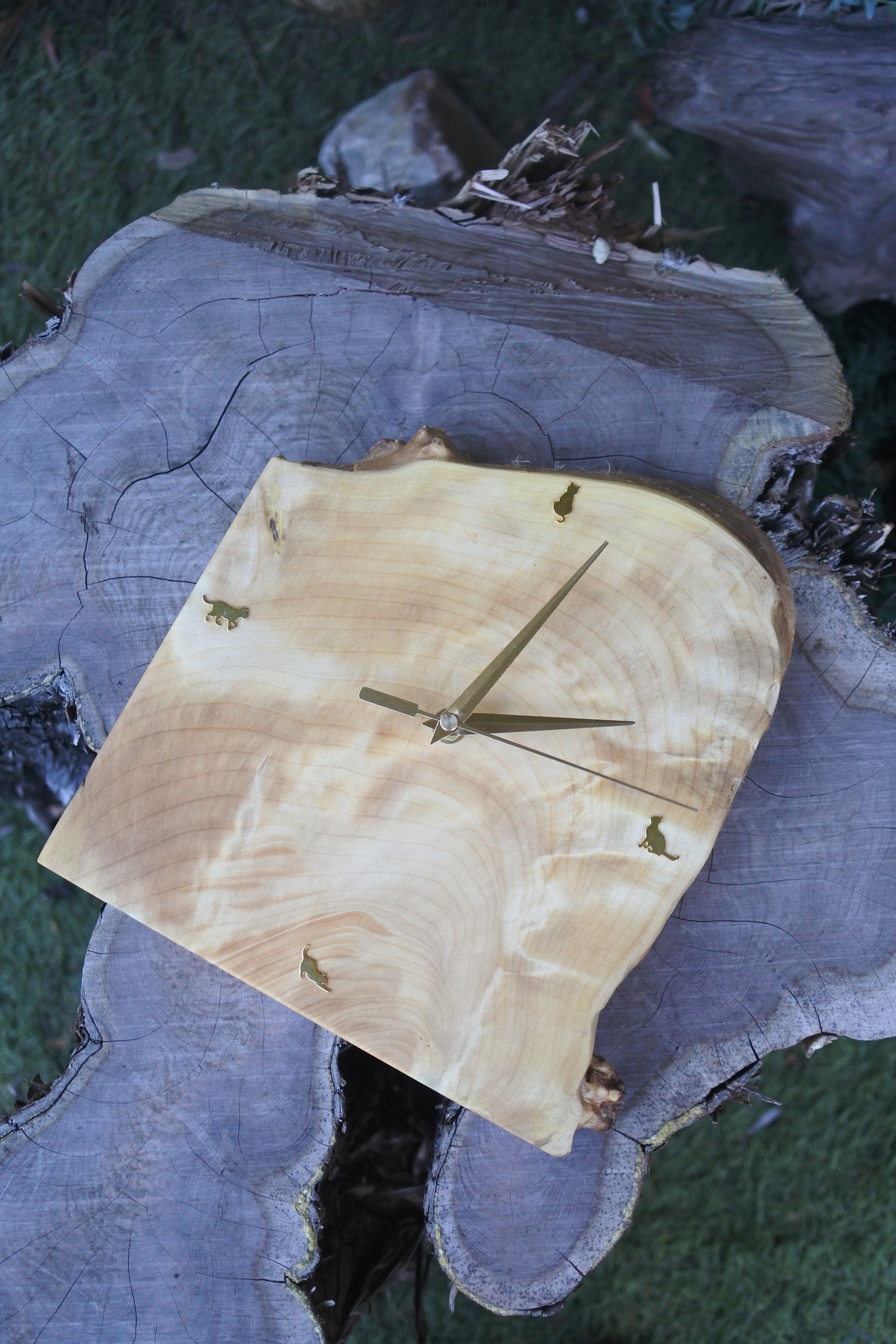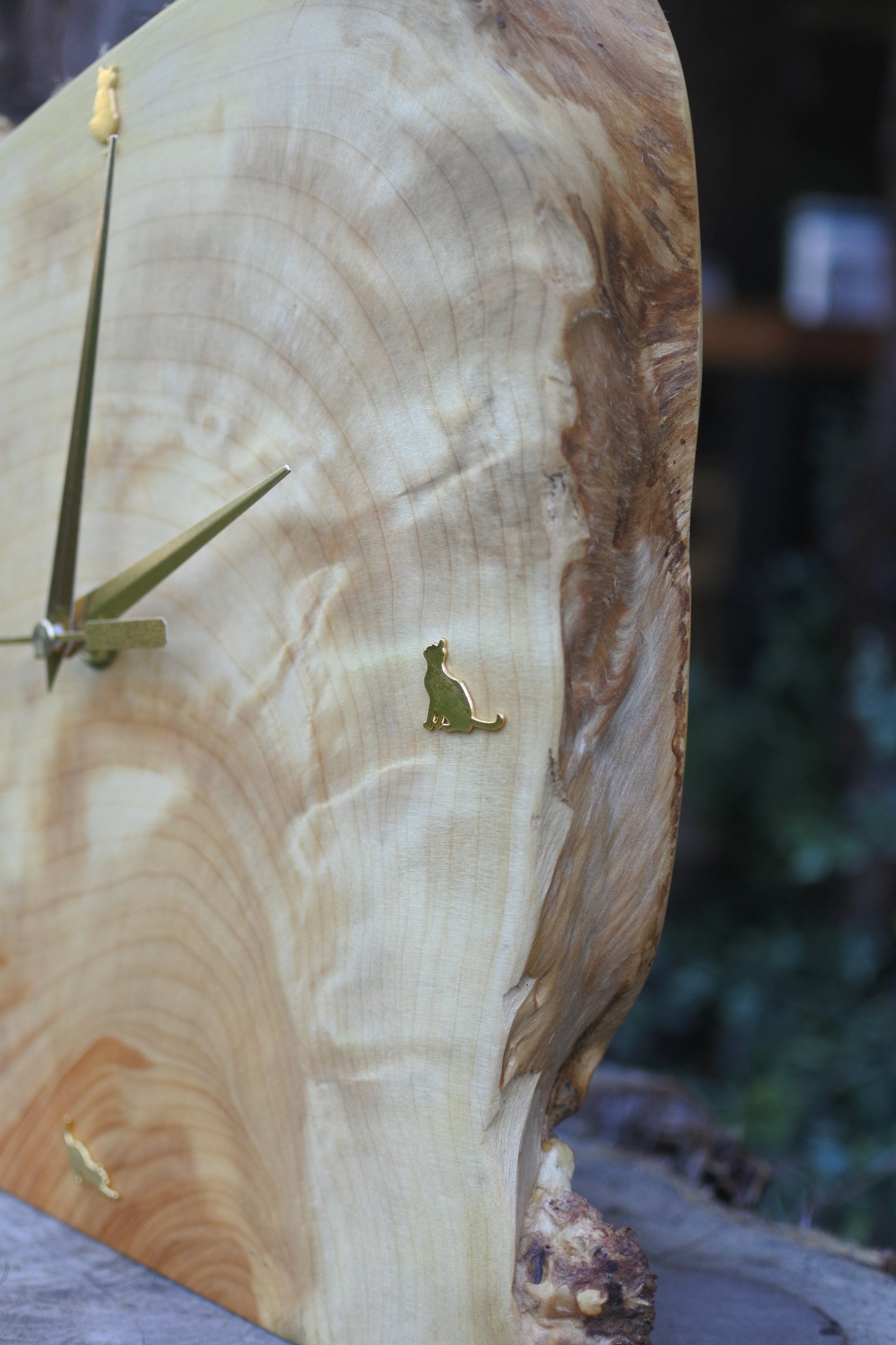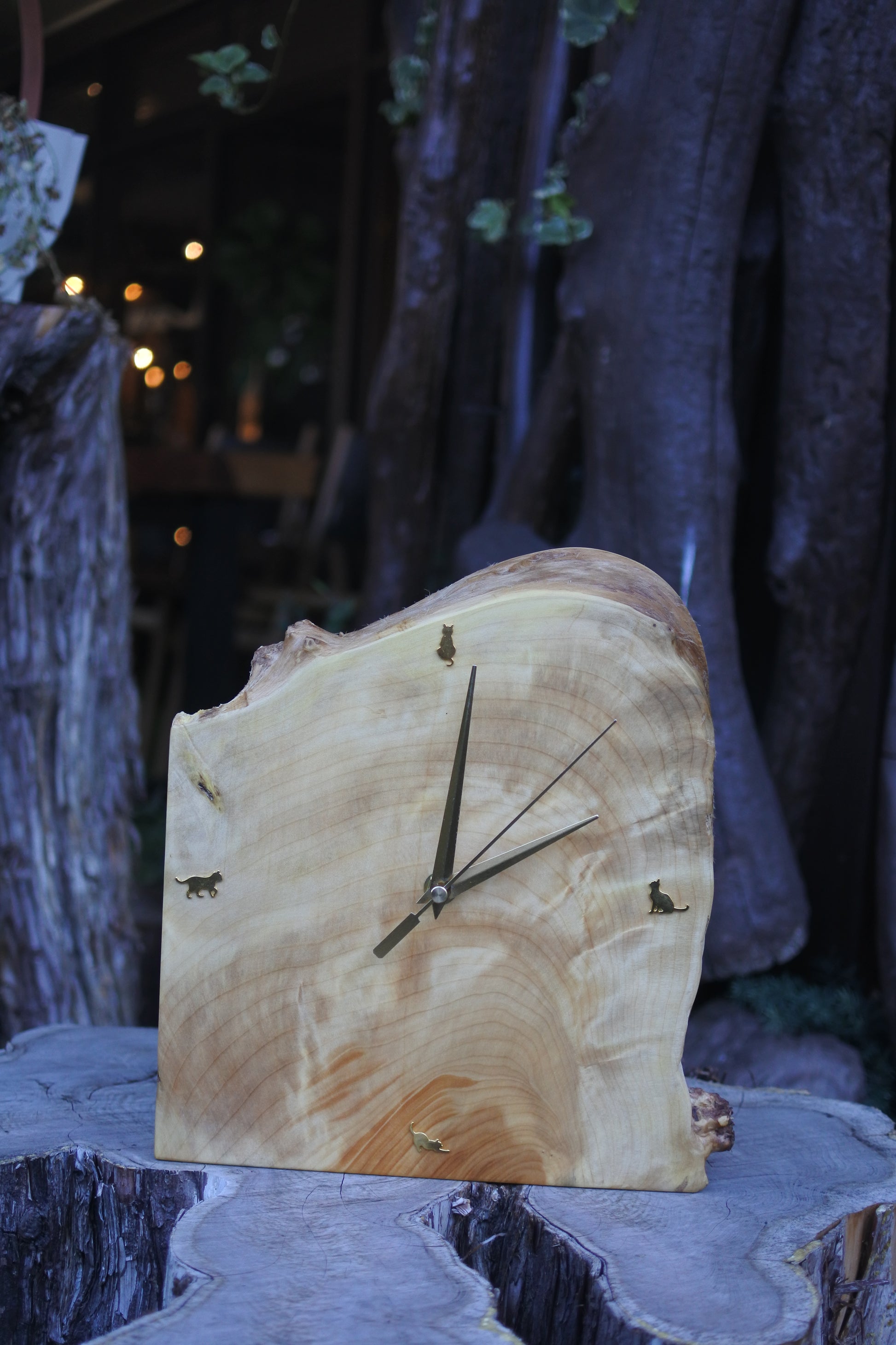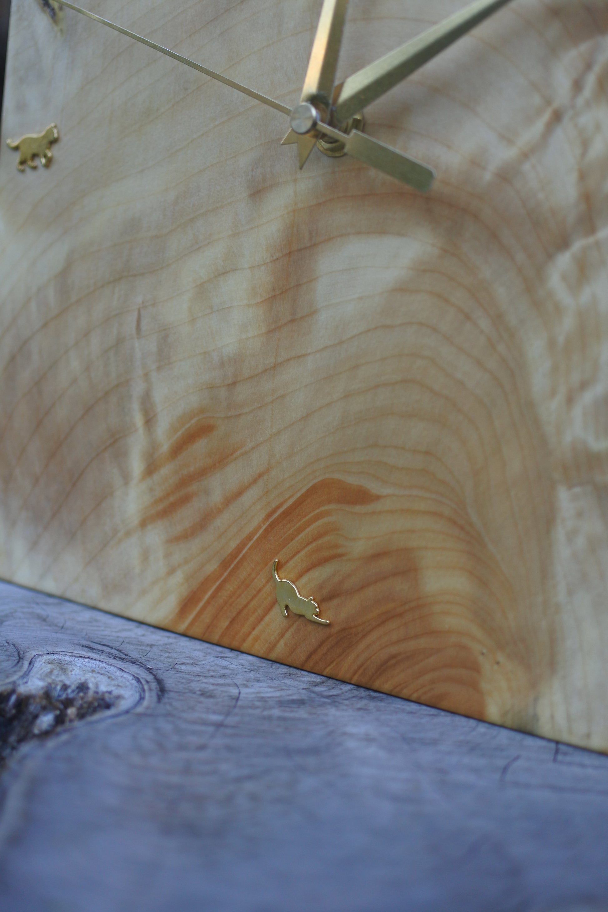 やわらかな木肌に浮かぶ美しい杢目の上で、ちいさな猫たちが時を見つめる――