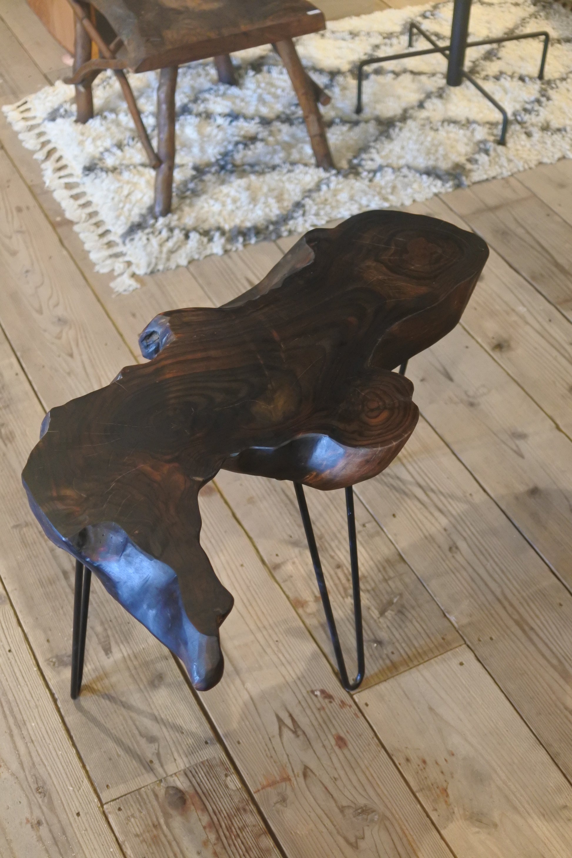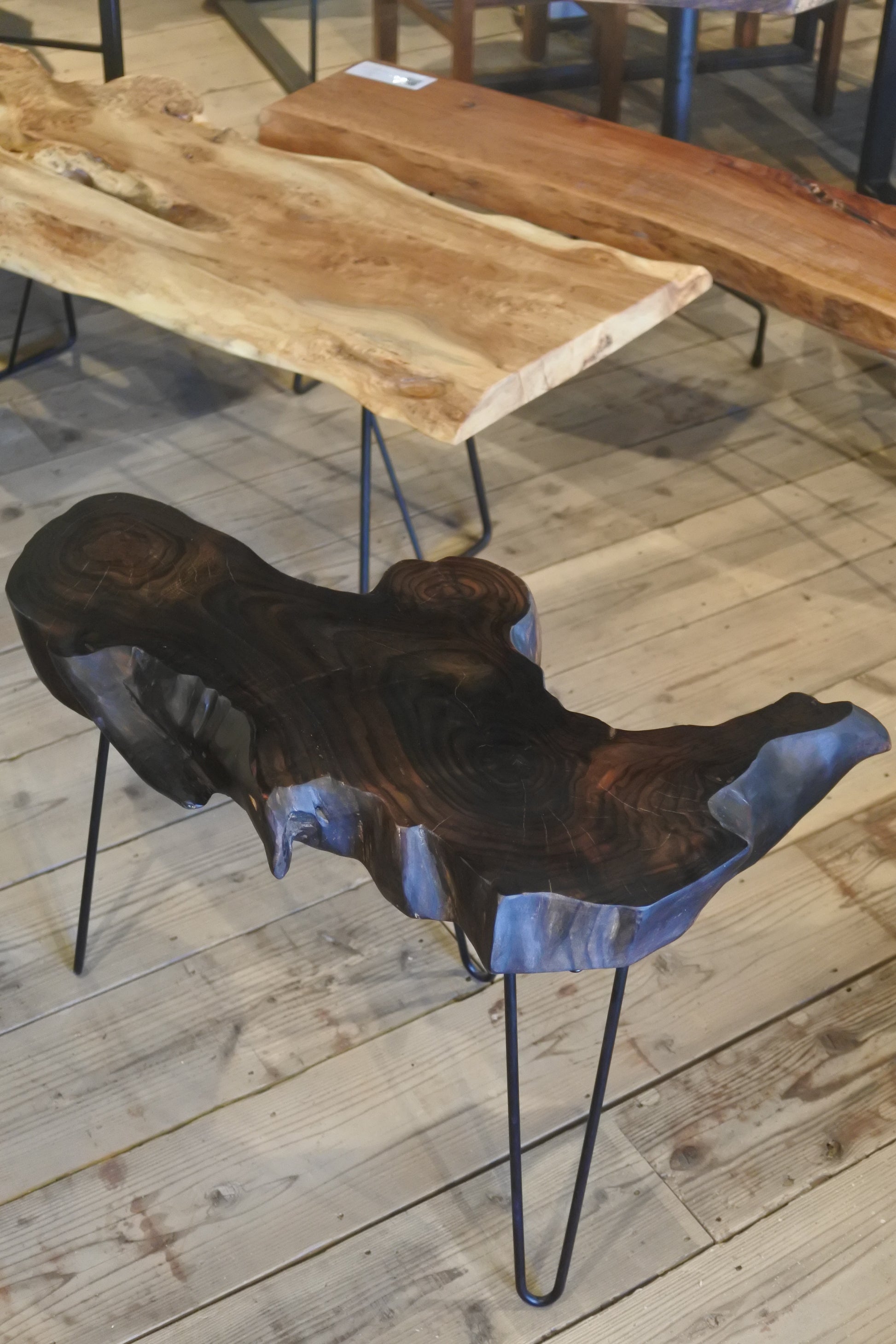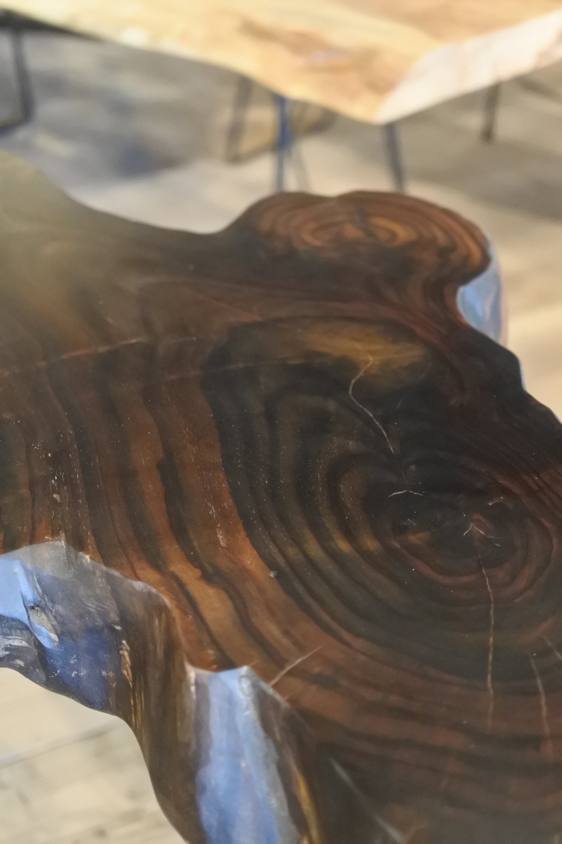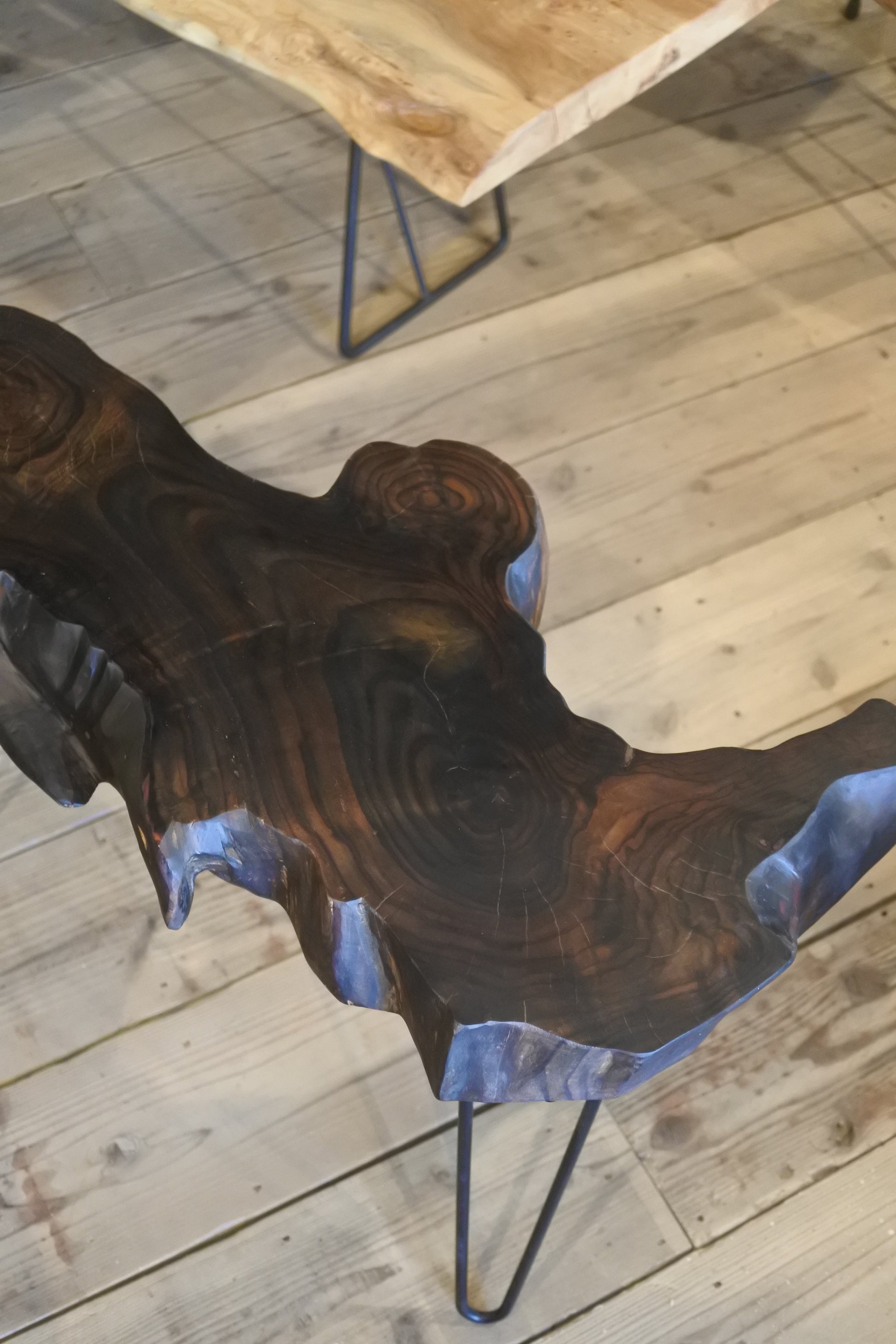 こちらのミニテーブルは、その神秘的な木肌を活かし、自然が彫刻したかのような有機的なフォルムに仕上げました。流れる年輪や立体的なうねりは、大河の流れや地図の大陸を思わせ、眺めるたびに想像を広げてくれます。